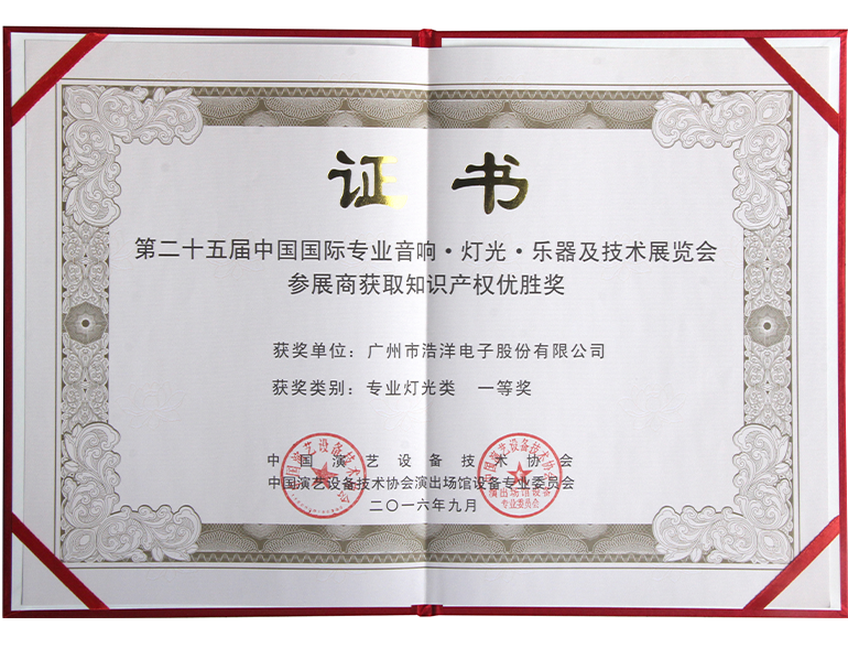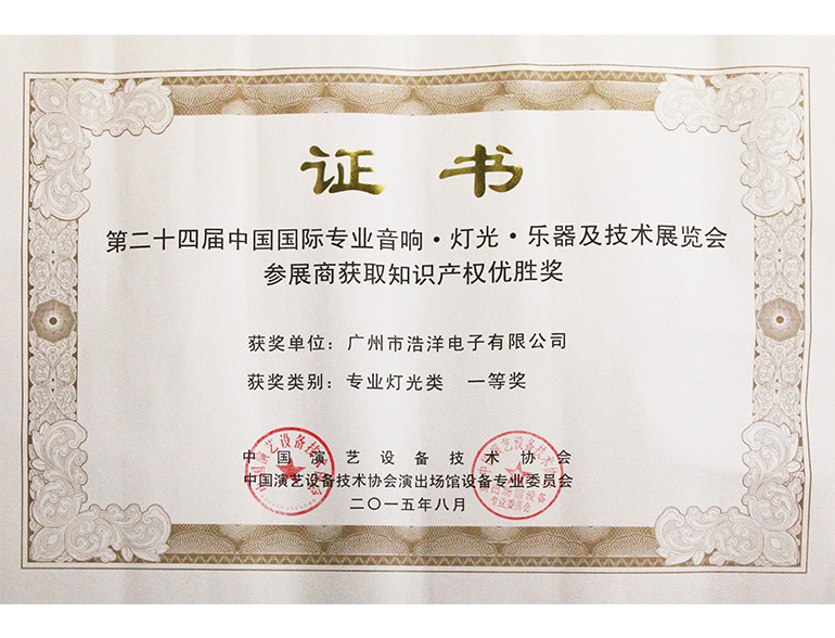 中國(guó)演藝設(shè)備協(xié)會(huì)第二十四屆PALM展知識(shí)產(chǎn)權(quán)優(yōu)勝獎(jiǎng)一等獎(jiǎng)