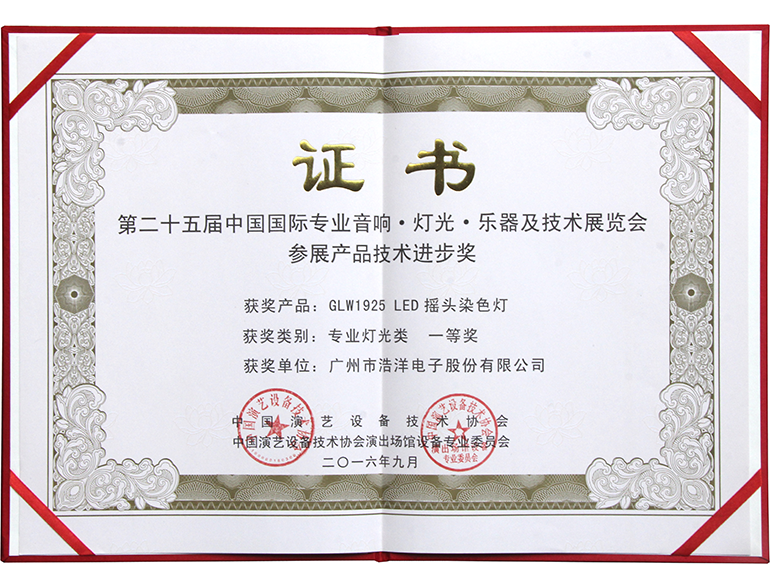 中國(guó)演藝設(shè)備協(xié)會(huì)第二十五屆PALM展產(chǎn)品技術(shù)進(jìn)步獎(jiǎng)一等獎(jiǎng)GLW1925