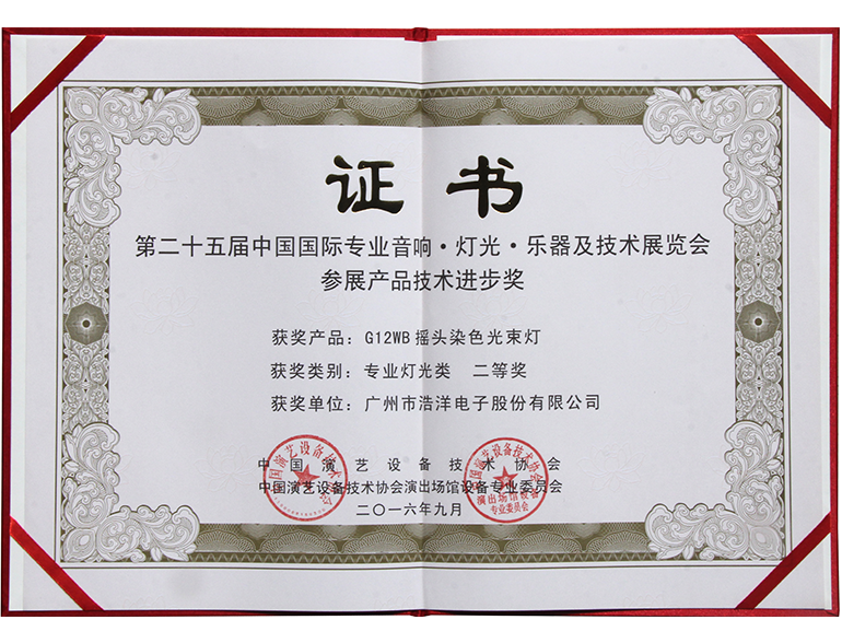 中國(guó)演藝設(shè)備協(xié)會(huì)第二十五屆PALM展產(chǎn)品技術(shù)進(jìn)步獎(jiǎng)二等獎(jiǎng)G12WB