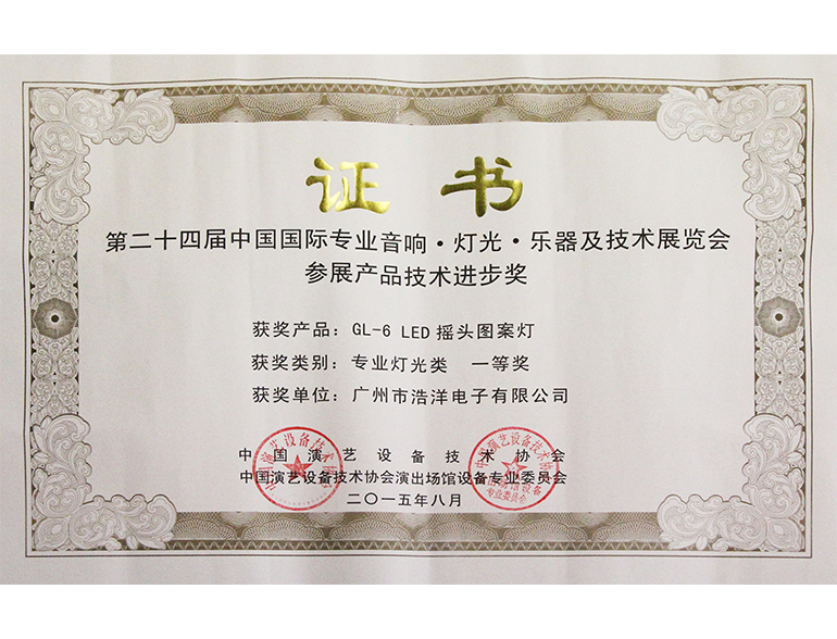 中國(guó)演藝設(shè)備協(xié)會(huì)第二十四屆PALM展產(chǎn)品技術(shù)進(jìn)步獎(jiǎng)一等獎(jiǎng)GL-6