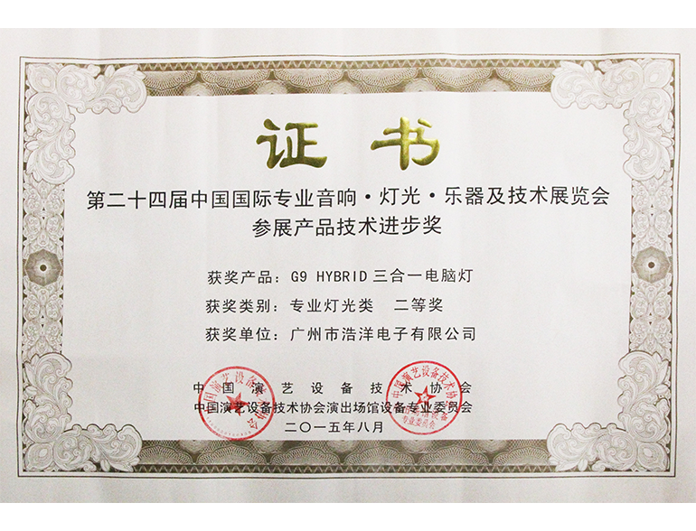 中國(guó)演藝設(shè)備協(xié)會(huì)第二十四屆PALM展產(chǎn)品技術(shù)進(jìn)步獎(jiǎng)二等獎(jiǎng)G9HYBRID