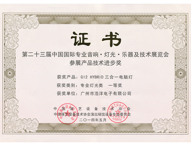 中國(guó)演藝設(shè)備協(xié)會(huì)第二十三屆PALM展產(chǎn)品技術(shù)進(jìn)步獎(jiǎng)一等獎(jiǎng)G12 HYBRID