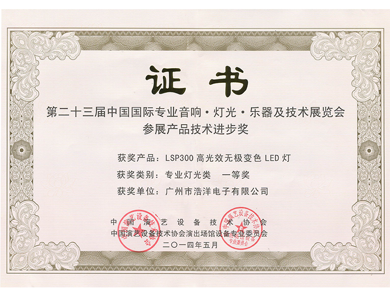 中國(guó)演藝設(shè)備協(xié)會(huì)第二十三屆PALM展產(chǎn)品技術(shù)進(jìn)步獎(jiǎng)一等獎(jiǎng)LSP300