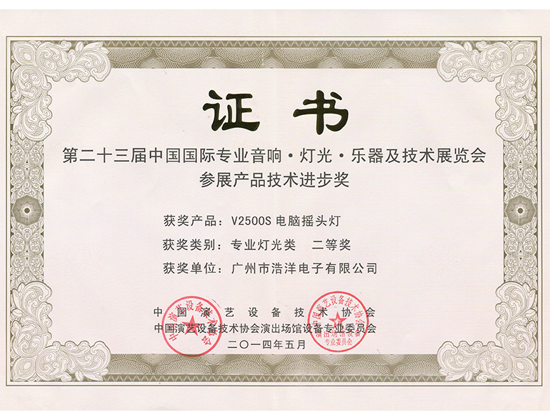 中國(guó)演藝設(shè)備協(xié)會(huì)第二十三屆PALM展產(chǎn)品技術(shù)進(jìn)步獎(jiǎng)二等獎(jiǎng)V2500S