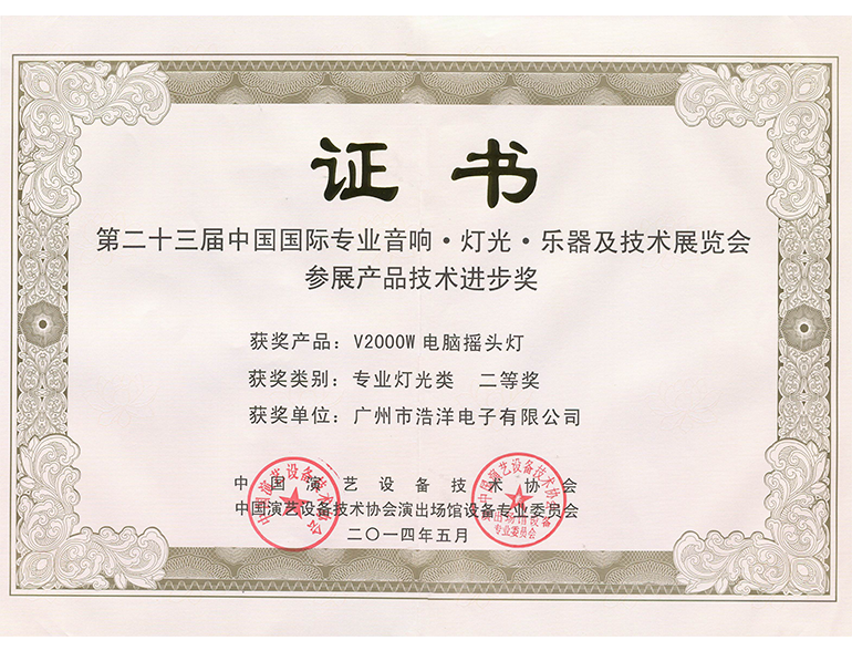 中國(guó)演藝設(shè)備協(xié)會(huì)第二十三屆PALM展產(chǎn)品技術(shù)進(jìn)步獎(jiǎng)二等獎(jiǎng)V2000W