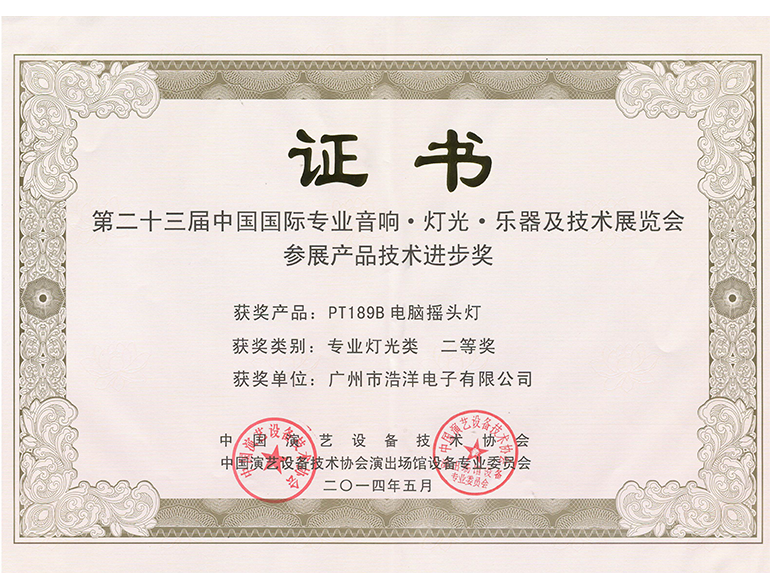 中國(guó)演藝設(shè)備協(xié)會(huì)第二十三屆PALM展產(chǎn)品技術(shù)進(jìn)步獎(jiǎng)二等獎(jiǎng)PT189B