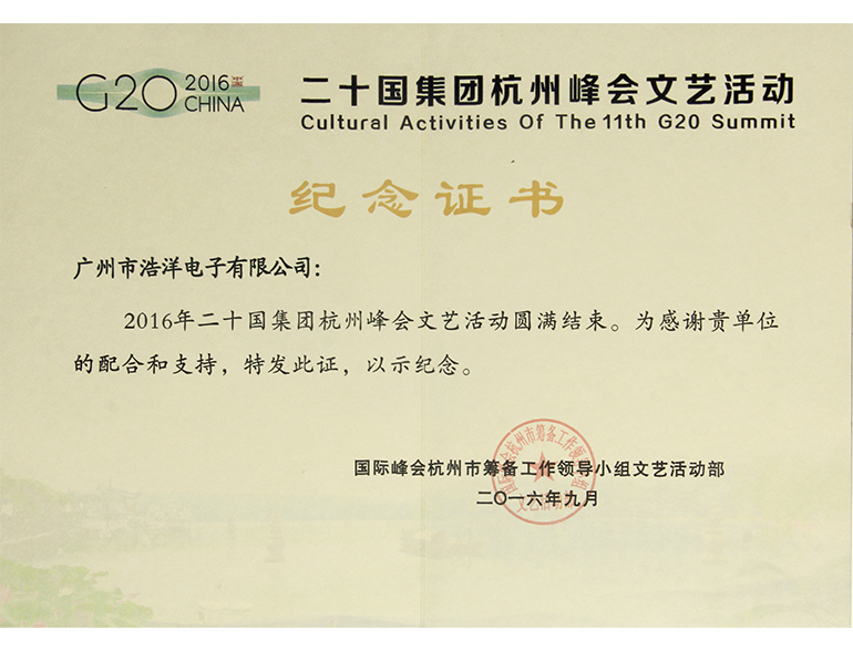 G20二十國集團(tuán)杭州峰會文藝活動紀(jì)念證書