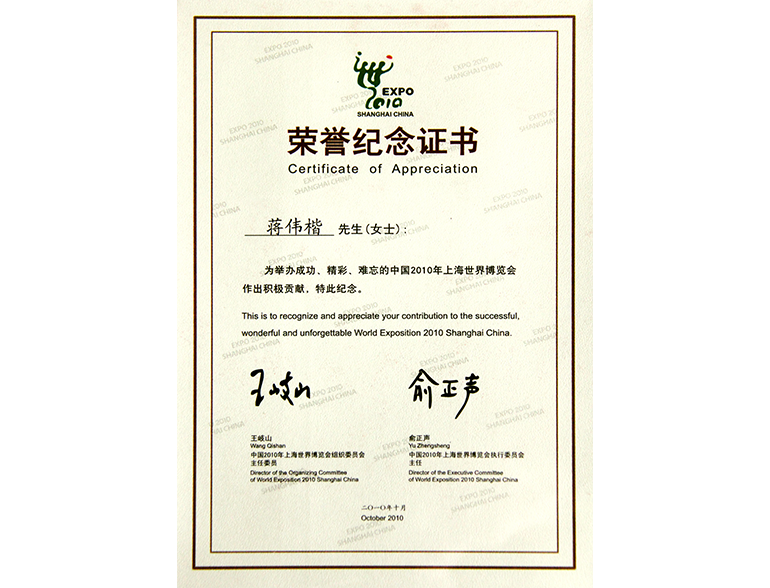 2010年上海世博會榮譽(yù)紀(jì)念證書