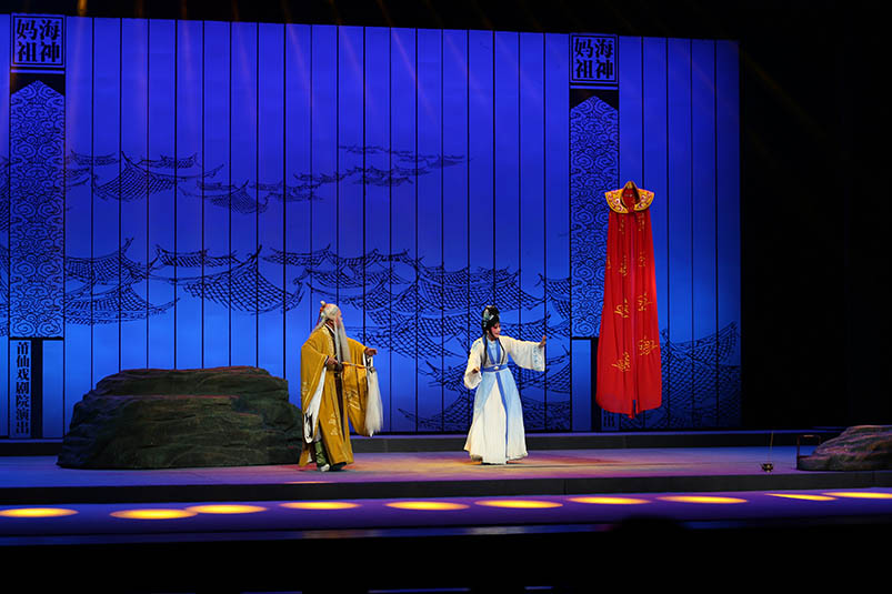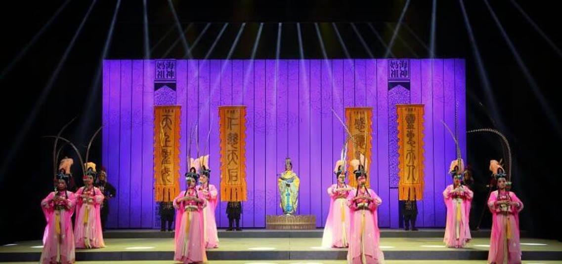 莆仙戲《海神媽祖》主要描述的是林默娘痛心海難無情而無私救苦救難,深得上天感動,最終被授予遇災警示及造福于民的法力,從平凡漁家女子到海上女神的傳奇。劇目以敘事詩般的藝術手法刻畫出媽祖娘娘扶危濟困的偉大形象,靈活展示了媽祖娘娘德、行善、大愛”的精神。隨著海上貿(mào)易和文化交流的延伸,媽祖信俗從沿海各地傳播到東南亞乃至全世界,媽祖也因此成為了“海上絲綢之路保護神”。