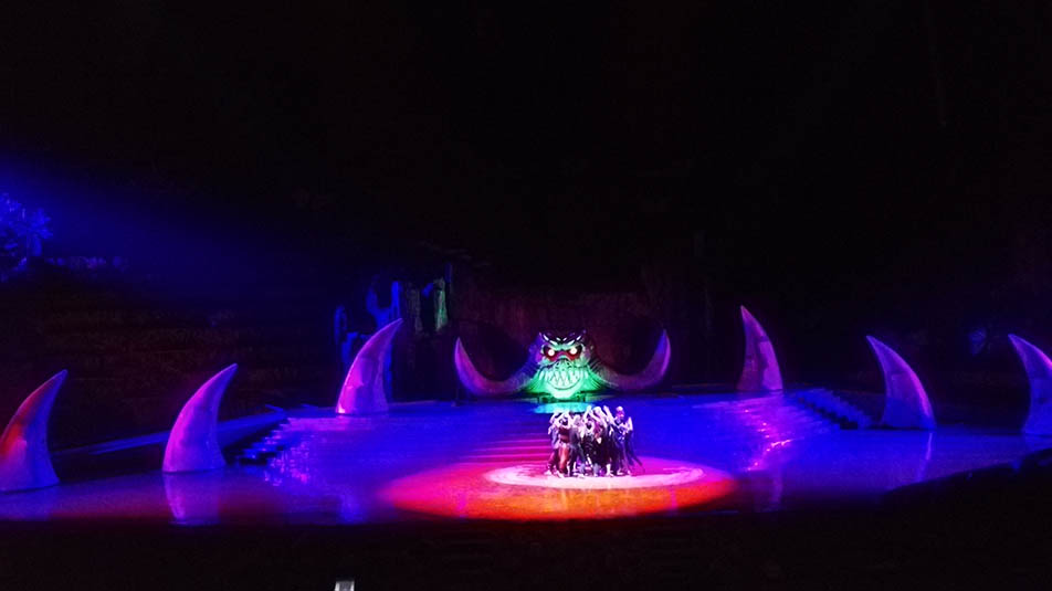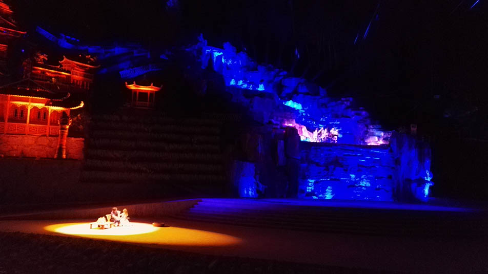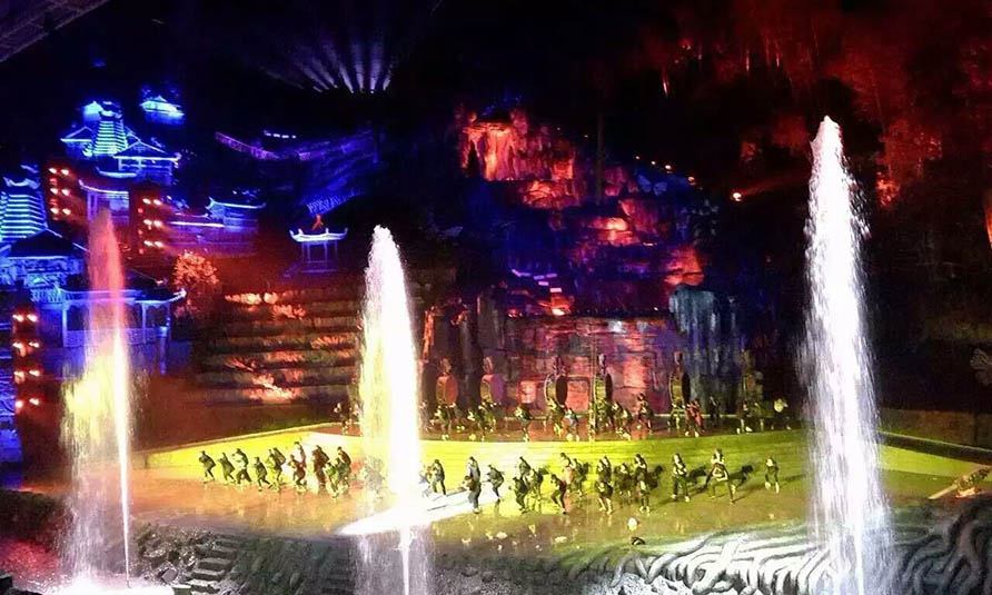 《薩瑪》以梵凈山下的侗族村寨、山水、竹海為背景,講述了發(fā)生在遠古侗族山寨里女主角“薩瑪”身上的凄美愛情故事??可矫嫠?、高度潮濕的演出環(huán)境,對燈光設備的質(zhì)量提出了極高的要求。該項目共使用浩洋電子旗下特寶麗(Terbly)品牌大功率LED切割燈GL-6、LED搖頭染色燈GLW190Z、搖頭圖案燈V1501S、追光燈FS800M、條形染色燈PB8D、及沉水式LED變色燈等合計近600臺。
