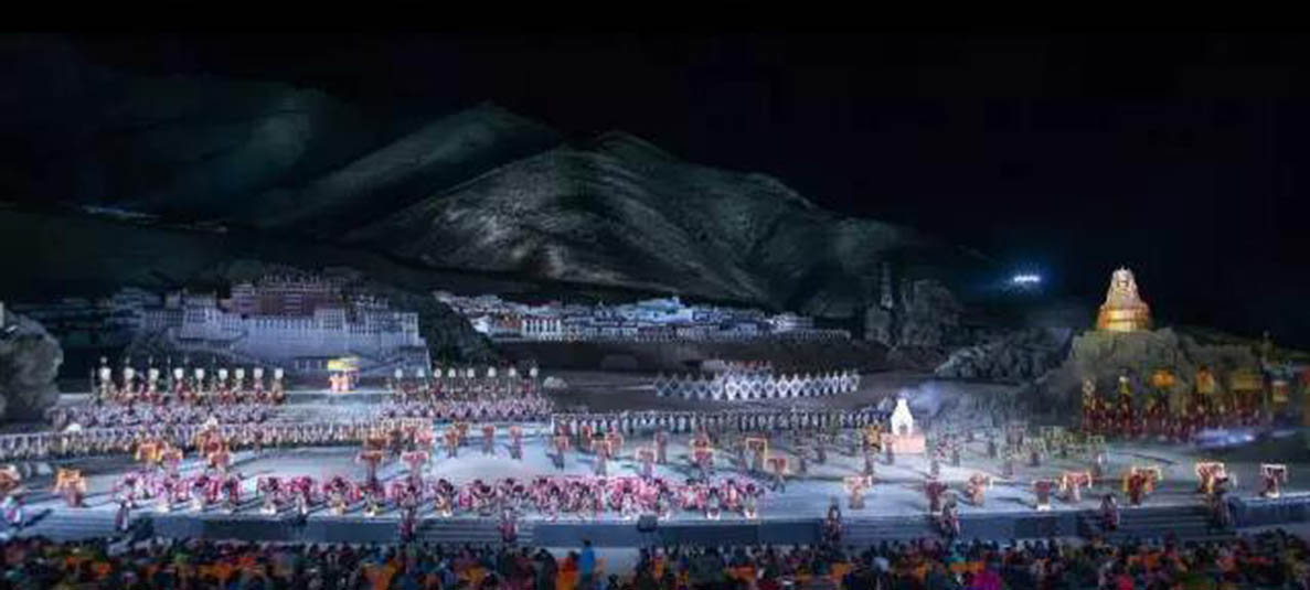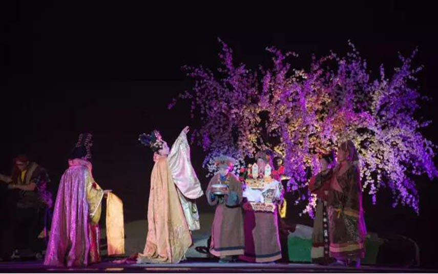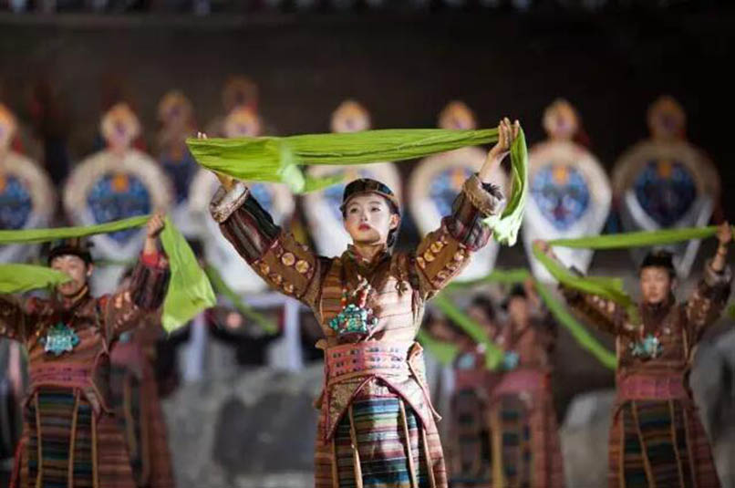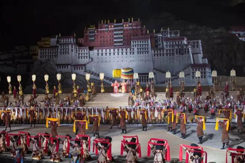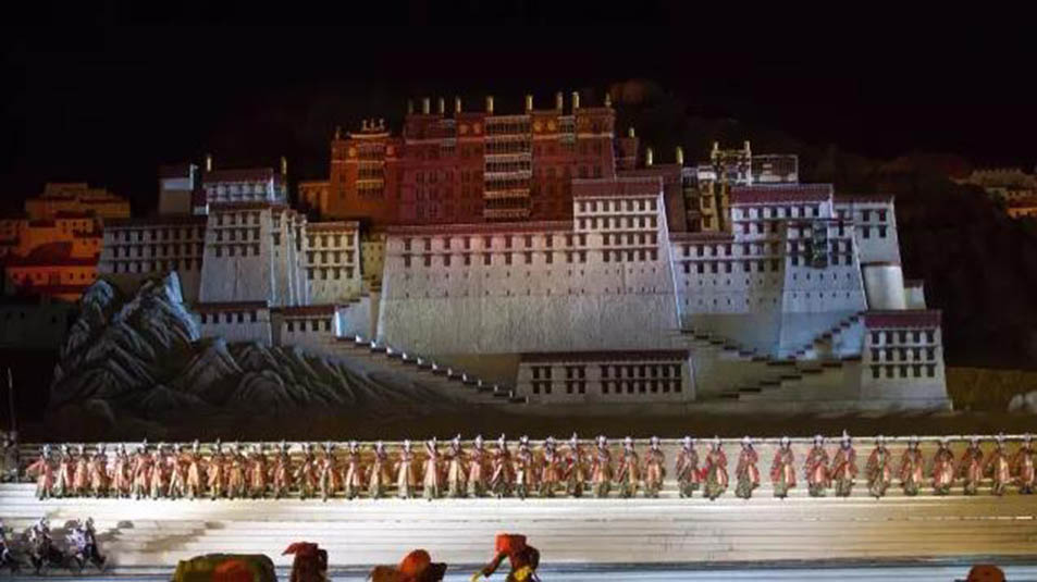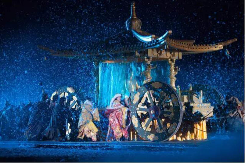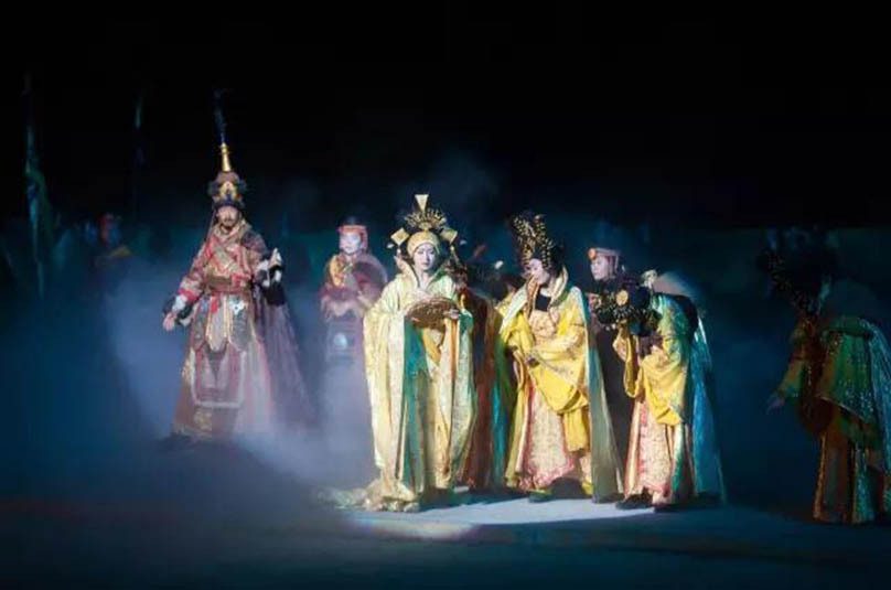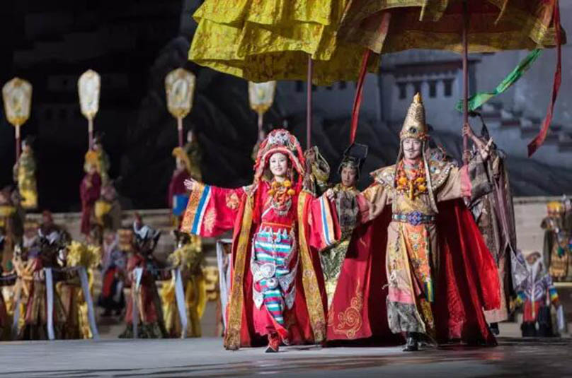 大型藏族實(shí)景劇《文成公主》主要講述文成公主入藏歷經(jīng)艱難的征途和曲折起伏的心路歷程,演繹大唐盛世的愛(ài)情傳奇,傳唱漢藏和美的動(dòng)人史歌。該作品分為“大唐之韻”、“天地梵音”、“藏舞大美”、“藏舞大美”及“藏舞大美”五幕,深度融入漢藏歷史文化、民族風(fēng)俗、自然景觀等,引入了大唐歌舞和流傳久遠(yuǎn)的藏舞、藏戲、佛號(hào)念唱等,通過(guò)人工舞臺(tái)與自然山水的結(jié)合,用高科技的手段呈現(xiàn)非物質(zhì)文化遺產(chǎn),把戲劇、音樂(lè)、舞蹈和現(xiàn)代舞美手段融為一爐,構(gòu)成華美樂(lè)章。