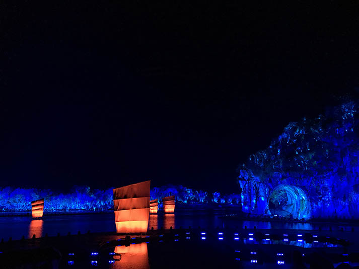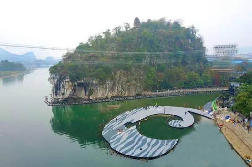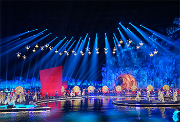 桂林象鼻山是今年央視春晚分會場之一,在舞臺搭建方面,以象鼻山作為整個舞臺的天然背景,突出象鼻山這一桂林山水文化元素,打造有“象山水月”寓意的舞臺效果。以山與水結(jié)合作為演出舞臺,舞臺燈具沒有辦法在水面上或者半空中搭建桁架,為此次戶外實景演出增加極大的難度。