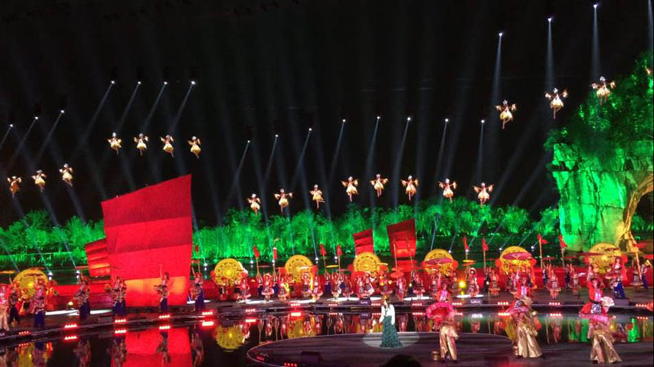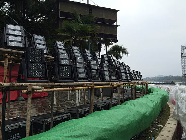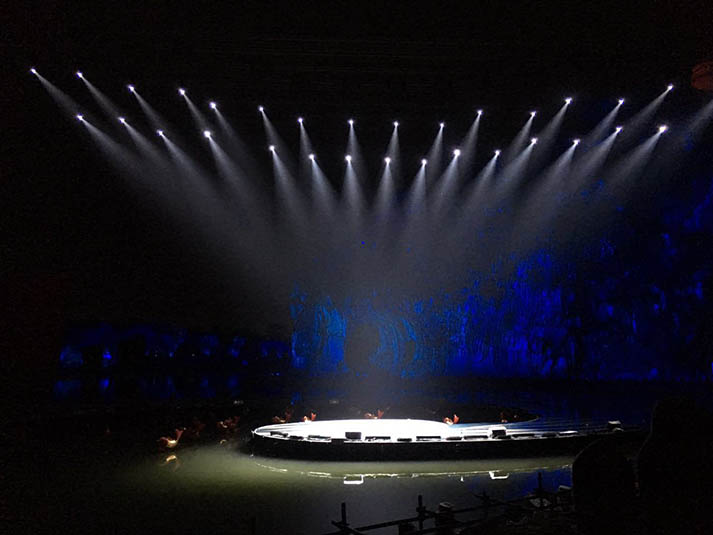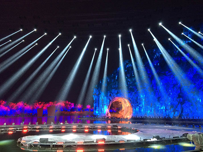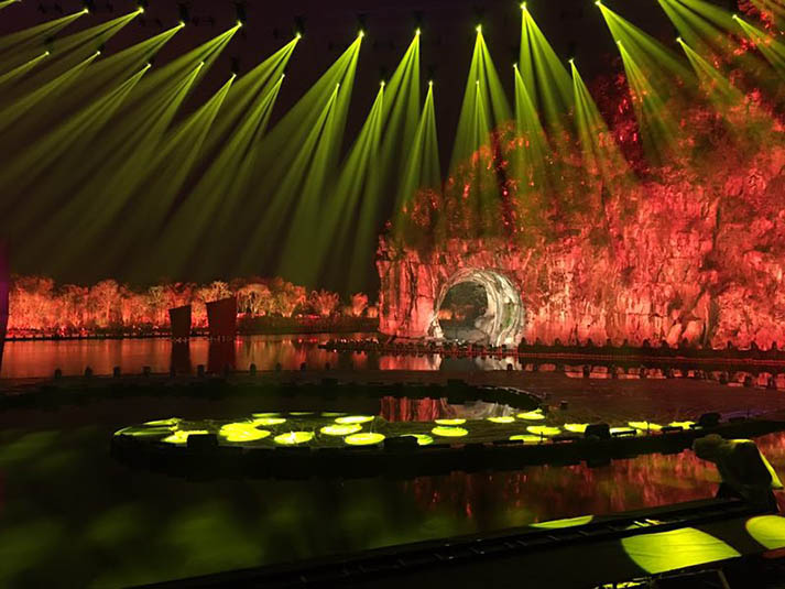浩洋電子采用內(nèi)置Philip全球首發(fā)鉑金21R光源的全新三合一電腦燈G21HYBRID,結(jié)合浩洋創(chuàng)新研發(fā)全新移動電源挑戰(zhàn)此次高難度的舞臺燈光設(shè)計,突破在水上搭建舞臺的重重困難,讓燈具首次高掛在半空,成功實現(xiàn)世界首創(chuàng)驚艷電腦燈飛行演出!為桂林分會場的舞臺燈光設(shè)計增添一大閃耀的關(guān)注點。而身處岸邊的染色燈City400擔(dān)任裝點象鼻山的重責(zé),將水中心的象鼻山裝點成一片綠意盎然的畫面。