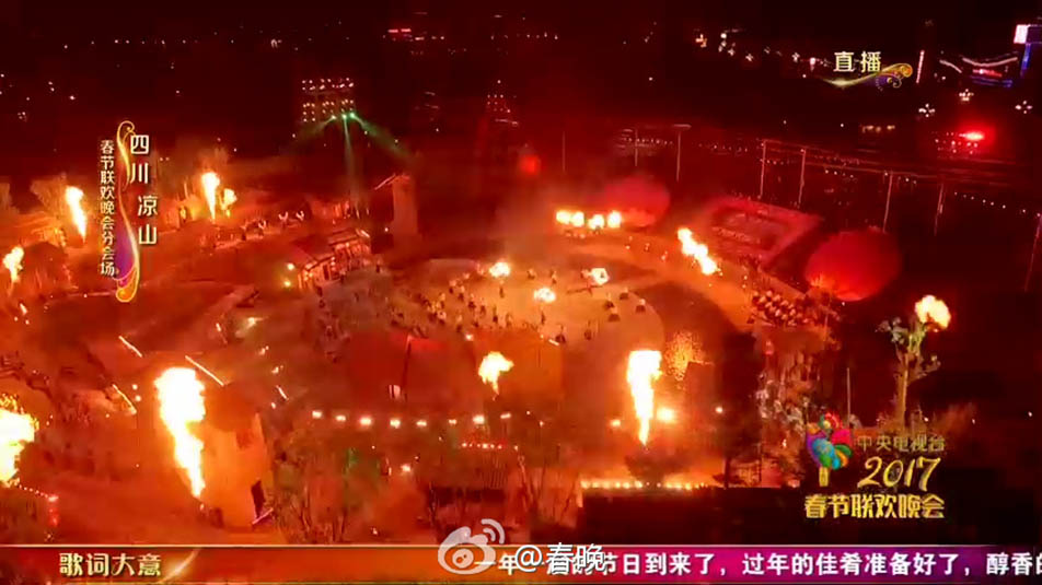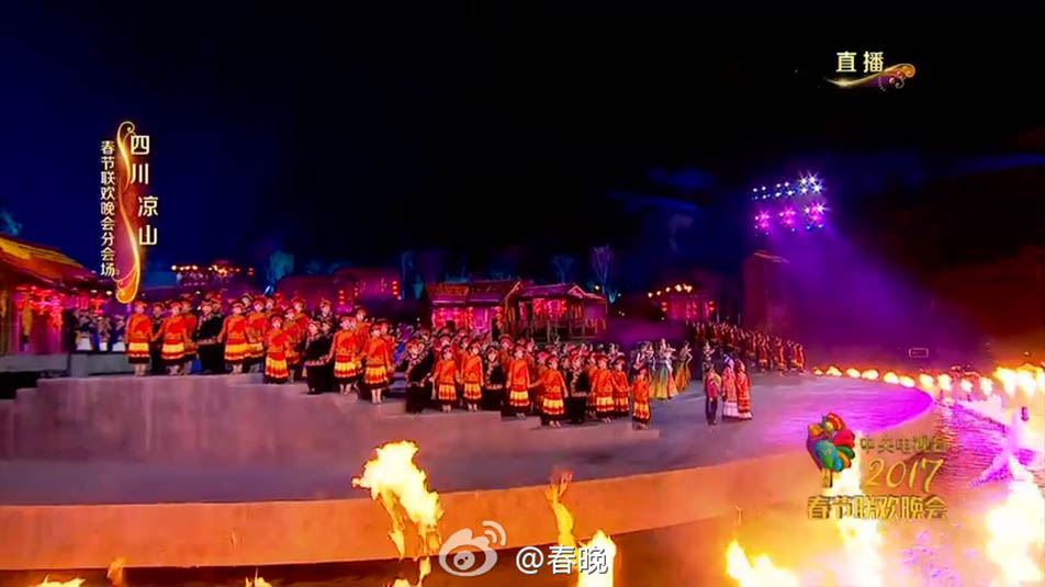 西昌作為央視春晚在西部的唯一一個分會場,主舞臺主要依托大型實景演出《阿惹妞》的表演場地,不僅再現(xiàn)涼山彝族早期的原生態(tài)生活場景,營造彝人的生活氣息,而且巧妙運用火元素,高科技的舞臺機械和水火特效相結(jié)合,呈現(xiàn)震撼的視覺效果。另外,在規(guī)模宏大的圓形廣場上聳天挺立,有56根紅色火炬形巨柱,各刻圖騰,象征全國56個民族的大團結(jié)。