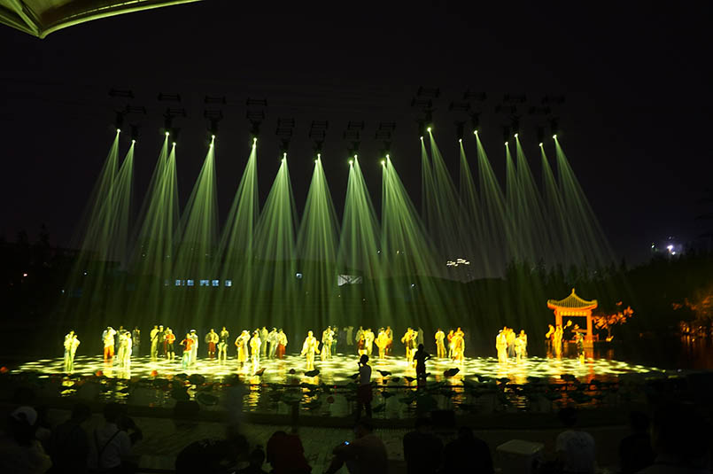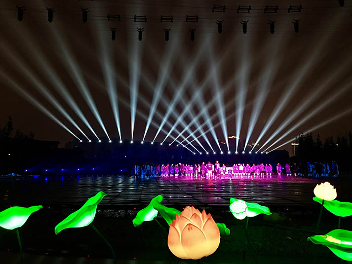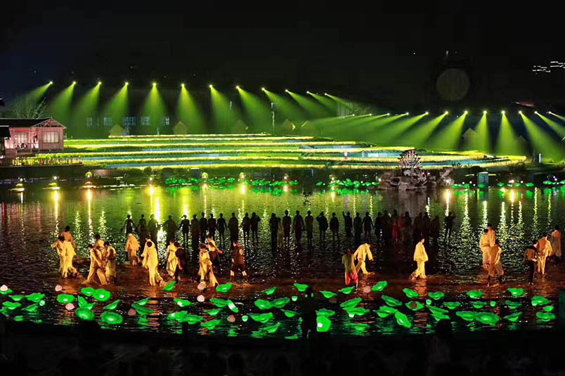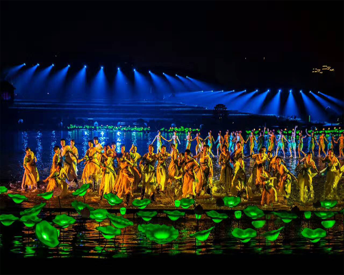 大型田園花火情境實(shí)景演出《瀏陽河上》是浩洋團(tuán)隊(duì)繼湖南常德首臺城市風(fēng)情實(shí)景秀《夢回穿紫河》重大燈光工程后的又一力作。該燈光工程共使用浩洋電子旗下特寶麗品牌IP65全能王三合一電腦燈、全能王三合一電腦燈G12 HYBRID、切割燈V3000P、追光燈FS800M、防水固定染色燈OVAL 48D、LED條燈等近1200臺專業(yè)舞臺燈。通過燈光設(shè)計與演出內(nèi)容的緊密結(jié)合,通過序曲和三大主題篇章,彰顯其多樣氣質(zhì)。