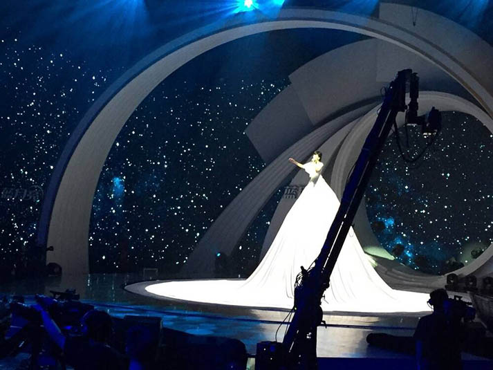 浩洋電子切割燈V3000P設(shè)置于舞臺(tái)面光和頂光位,染色燈V2000W則主要擔(dān)負(fù)大范圍鋪光染色效果,上圖是切割燈V3000P在晚會(huì)上的精彩表現(xiàn),女神趙雅芝在聲光電制造的舞美效果中,優(yōu)雅獻(xiàn)唱,效果非凡。