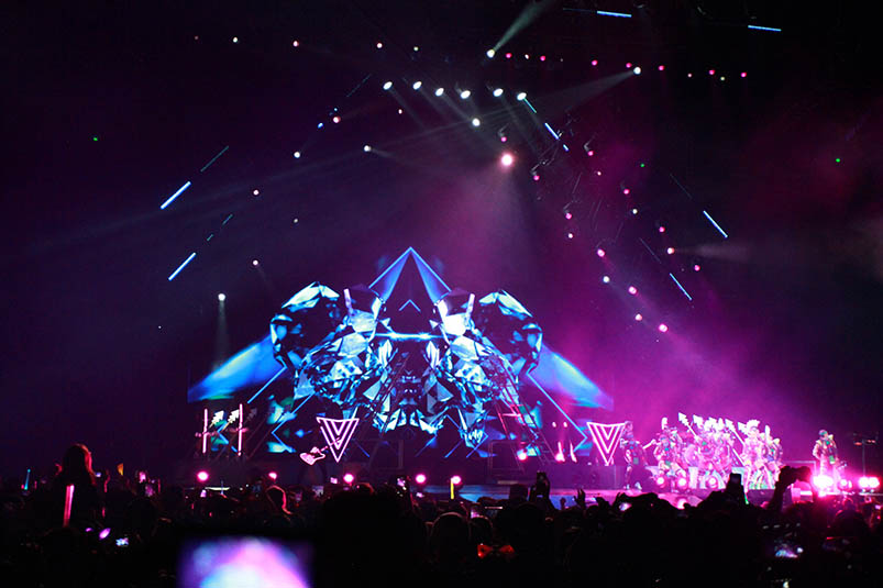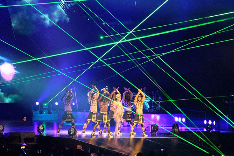 當(dāng)晚,在特別嘉賓DJ雙人組The Dolls長(zhǎng)達(dá)近半小時(shí)的熱場(chǎng)后,Katy Perry身著一襲紫色熒光虎面緊身超短于晚上21時(shí)閃亮登場(chǎng)。水果姐在近90分鐘的時(shí)間里,以百變?cè)煨秃蛣鸥锜嵛?,high翻全場(chǎng),浩洋電子燈具交相輝映,完美融入音樂旋律中,讓臺(tái)下粉絲徹底沸騰!