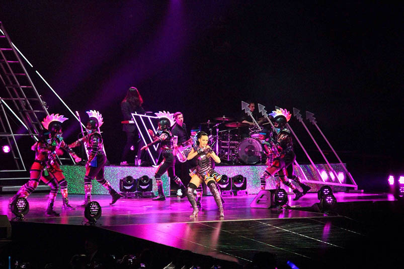 Katy Perry以開場(chǎng)曲《Roar》拉開序幕,之后《E.T》、《California Gurls》(加州女孩)、《TeenageDream》(花漾年華)、《Wide Awake》(如夢(mèng)初醒)等金曲一首不落,引發(fā)粉絲的尖叫聲和喝彩此起彼伏。配合演唱會(huì)主題,水果姐造型百變服飾斑斕,她時(shí)而變身俏麗貓女在《Hot N Cold》(忽冷忽熱)的音樂中與舞伴嬉戲,時(shí)而以埃及艷后的高貴之姿騎優(yōu)雅坐上《DarkHourse》(黑馬),一轉(zhuǎn)眼又身穿向日葵長(zhǎng)裙化身女神抱著吉他動(dòng)情演繹《The One That Got Away》(離開的人是你),讓人看得眼花繚亂。