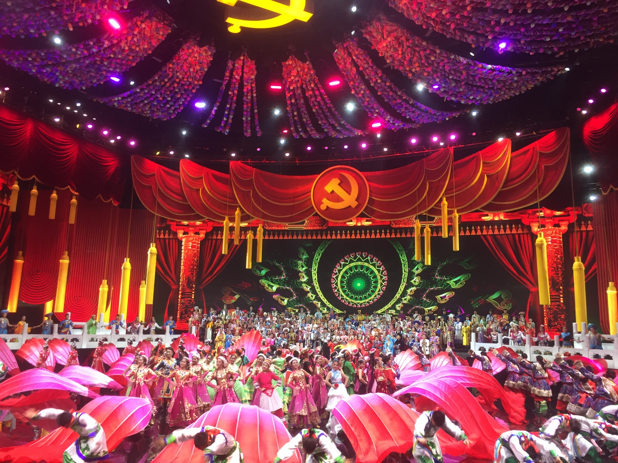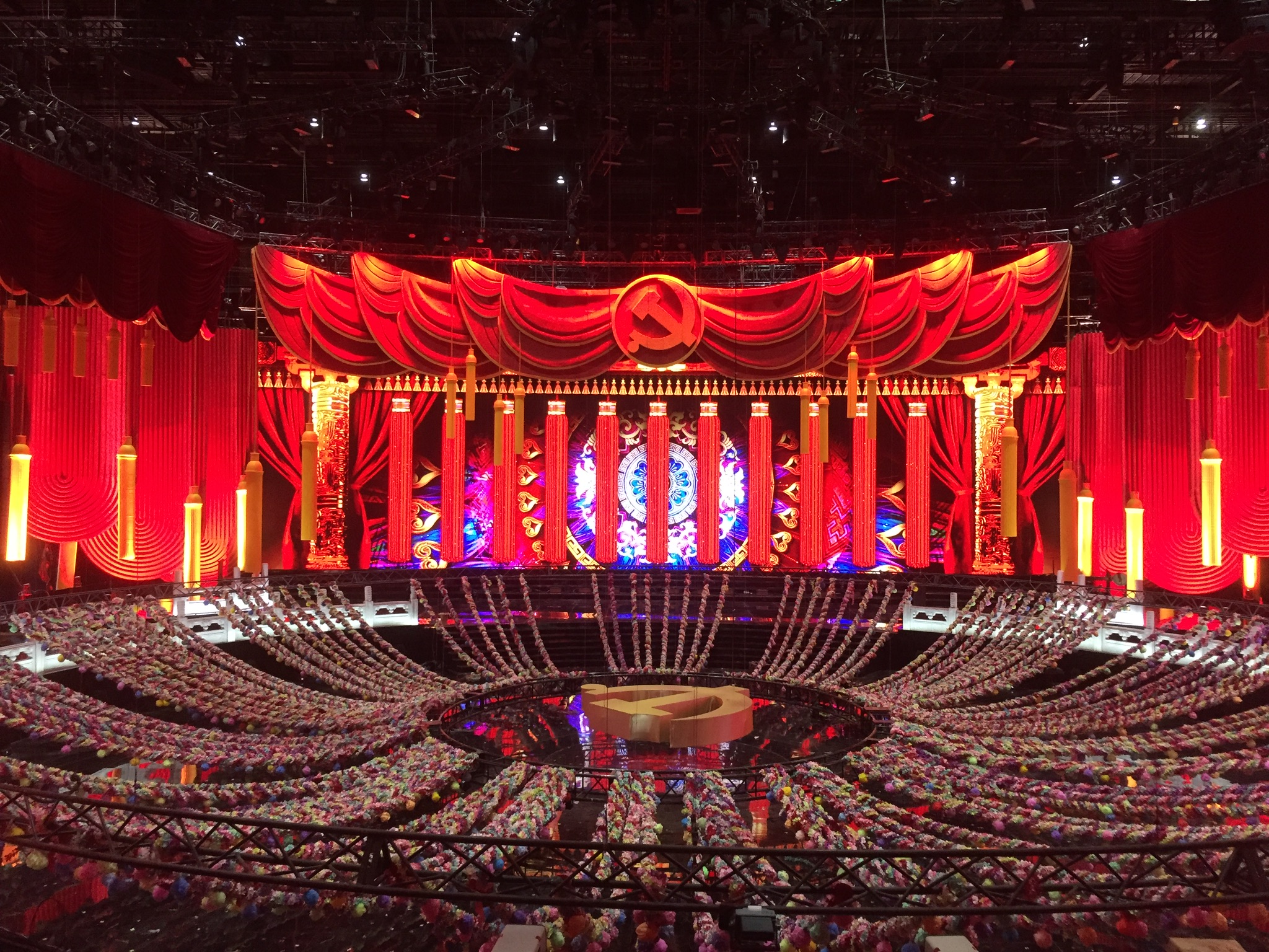 與舞臺(tái)美術(shù)一起打造一臺(tái)莊嚴(yán)、宏大的慶祝黨的十九大勝利召開(kāi)的文藝晚會(huì),必定要少一些平日電視欄目燈光“秀”的成分,一切以滿足節(jié)目需要而出發(fā)?!敖鹕薄凹t色”的主色彩應(yīng)用,貫穿晚會(huì)始終。