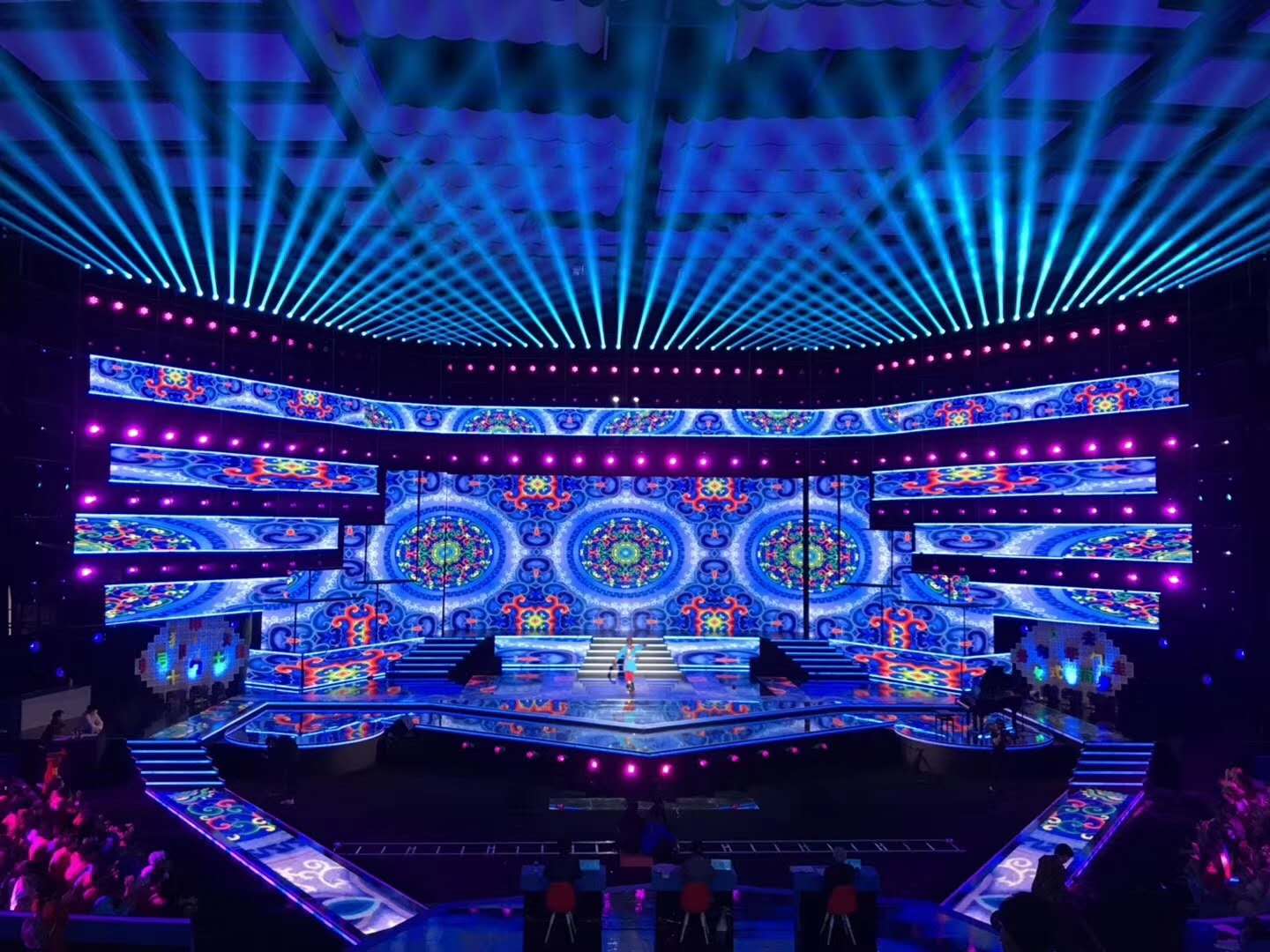 其中,浩洋電子1400W的氣泡光源高顯指圖案切割燈V4000P在舞臺上的表現(xiàn)尤為突出,在保證燈具高光通量輸出的同時,也保證了極高的光斑均勻度,投射出很好的光質(zhì);其點(diǎn)狀梳形結(jié)構(gòu)的CMY+CTO+CTB混色系統(tǒng),也使之保持均勻順滑混色效果;最值得一提的是,其顯色指數(shù)高達(dá)97,最為接近太陽光100的顯色指數(shù)。在浩洋電子V4000P的照射下,其顯示的顏色與在自然光照下所顯現(xiàn)的顏色差異比較小,更接近自然原色,其色彩還原性極為出色!