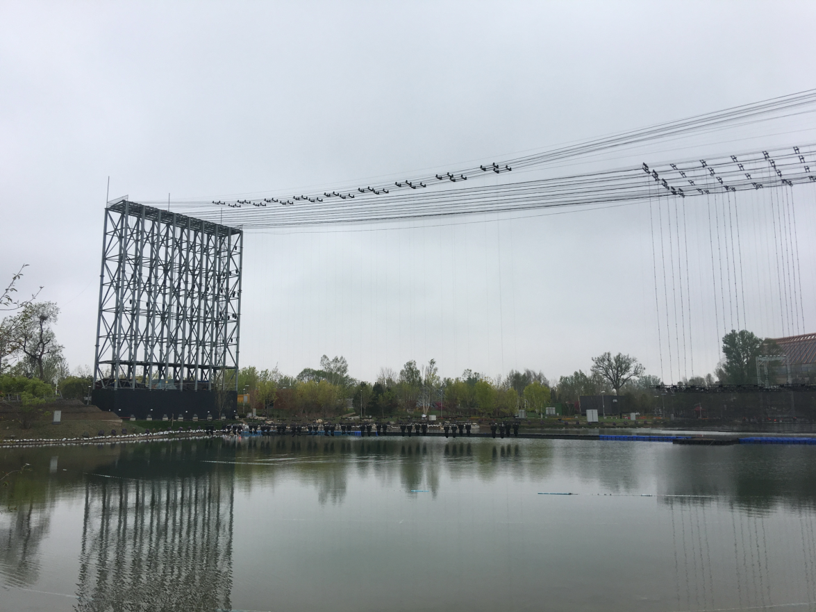 為了承載背景網(wǎng)屏和燈光設(shè)備,開幕式專門臨時搭建了兩座鋼結(jié)構(gòu)威亞塔架,塔高39米,塔間跨度280米。塔間共搭設(shè)重型威亞索道16套,吊點總數(shù)218個。使用威亞控制系統(tǒng)將藝術(shù)空間擴展升華,空中矩陣隱形LED屏幕、空中矩陣數(shù)控飛燈等與地面舞臺表演完美結(jié)合,給觀眾帶來超強的視覺震撼效果。