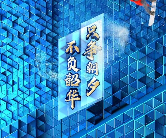 該篇章以藍(lán)色為主背景色,主要展示中國(guó)的科技發(fā)展成果,包含航天器,太空站等科技元素,配以?shī)W運(yùn)冰雪元素帶出本篇章的主題“不負(fù)韶華 只爭(zhēng)朝夕”。