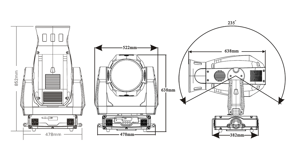 可從控臺完成更改DMX地址碼,遙控開關(guān)燈泡,機器重設(shè),聲控模式的轉(zhuǎn)換等功能