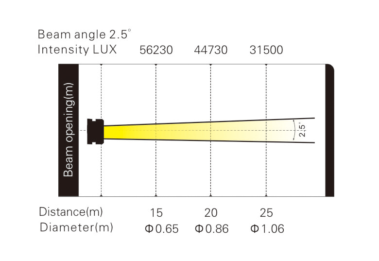 光斑角度:2.5°,獨(dú)特的光路結(jié)構(gòu)使光束效果更強(qiáng)更亮