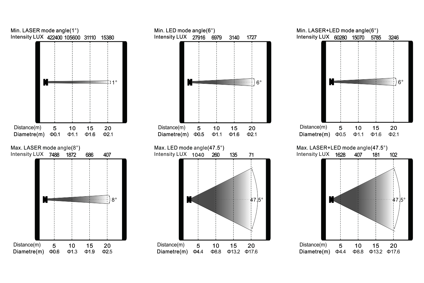 放大:激光模式:1°- 8°,LED模式:6°- 47.5°,激光+LED模式:6°- 47.5°