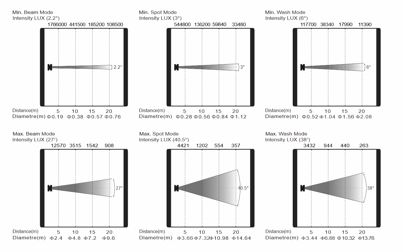 變焦范圍:光束模式:2.2°-27°,圖案模式:3°-40.5°,染色模式:6 -38°