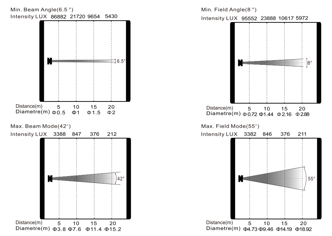 變焦范圍:光束角:6.5°-42°,光斑角:8°-55°