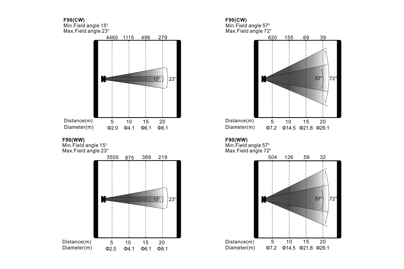 放大:光束角:15°-57°,光斑角:23°-72°,4倍電動(dòng)線性變焦
